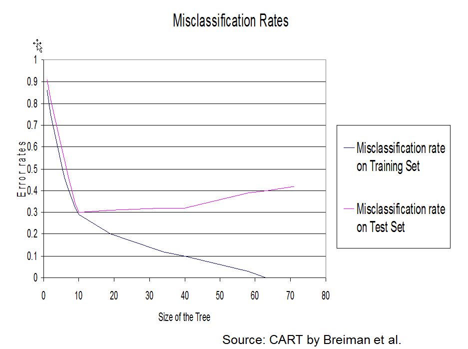 As said earlier it has been found that the best method of arriving at a suitable size for the tree is to grow an overly complex one then to prune it back. The pruning is based on the misclassification rate (number of observations misclassified divided by the total number of observations, see also confusion table). However the error rate will always drop (or at least not increase) with every split. This does not mean however that the error rate on the test data will improve.